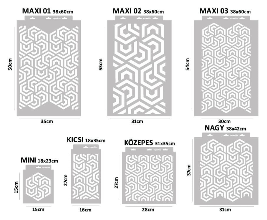 A Hatszög 05 stencilcsalád geometrikus mintájú, minden irányba folytatható sablonokat tartalmaz, amelyek többféle léptékben érhetők el.