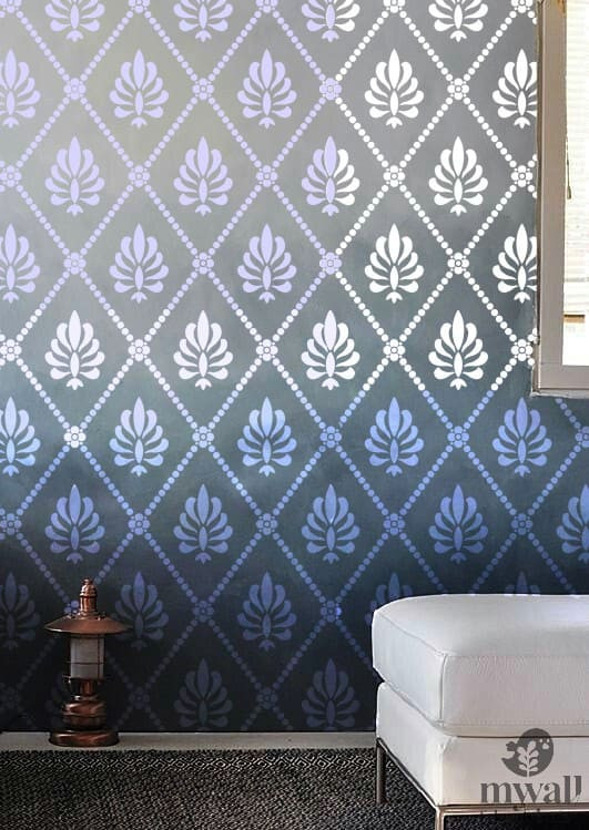 Kecses pálmalevelek rombusz hálóba rendezve, és rombuszok nélül. Finom, nőies, elegáns stencilcsalád.