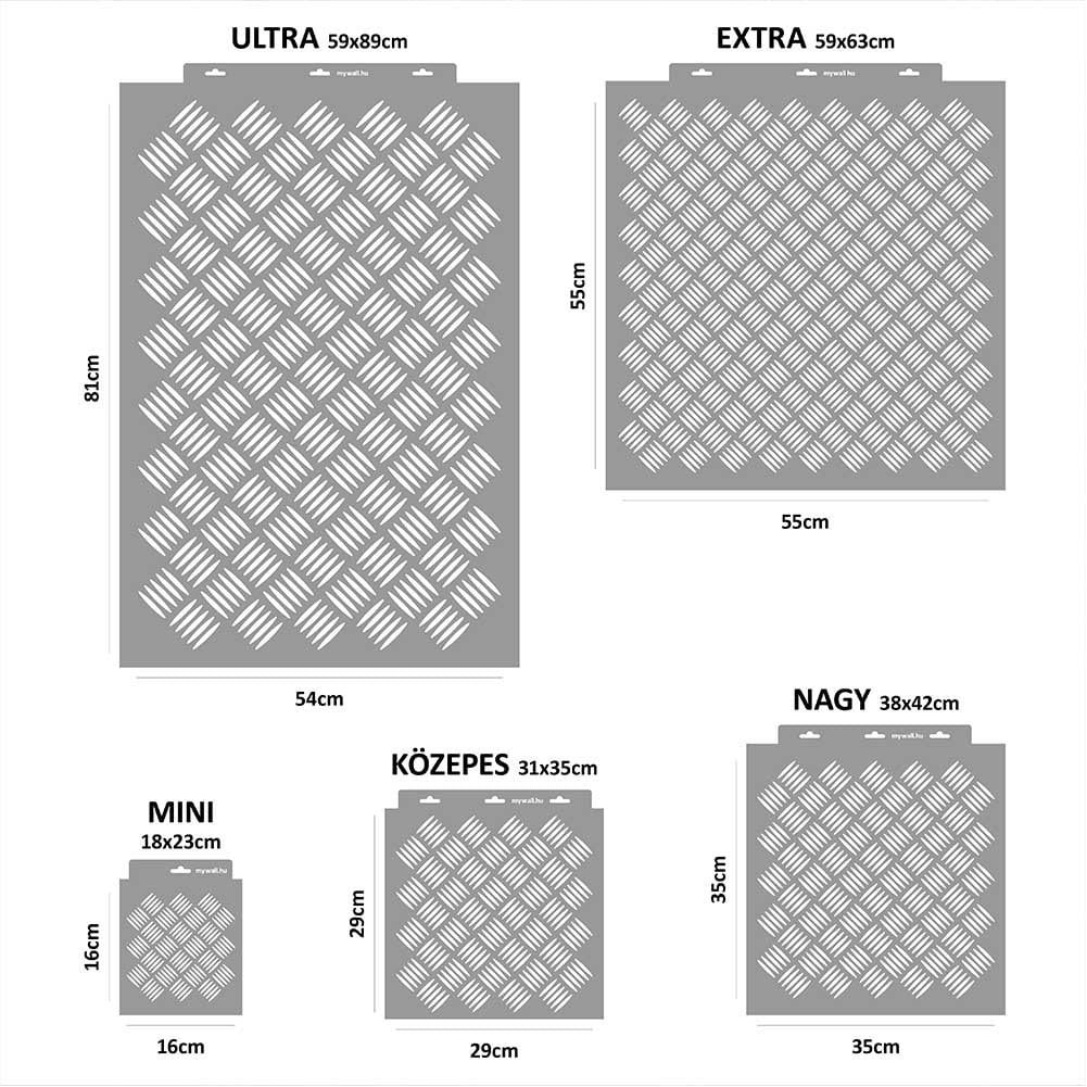 A MyWall Acéllemez 02 stencil segítségével könnyedén létrehozható az ipari jellegű, bordáslemez mintázat. Modern, high-tech enteriőrök tökéletes kiegészítője, amely falon, padlón, bútoron vagy akár textilen is alkalmazható. A tartós, újrahasználható stencil precíz vonalvezetést biztosít, így a végeredmény élethű és részletgazdag lesz. A legjobb hatás érdekében érdemes 3D technikával dolgozni, amely még jobban kiemeli a minta textúráját és mélységét.