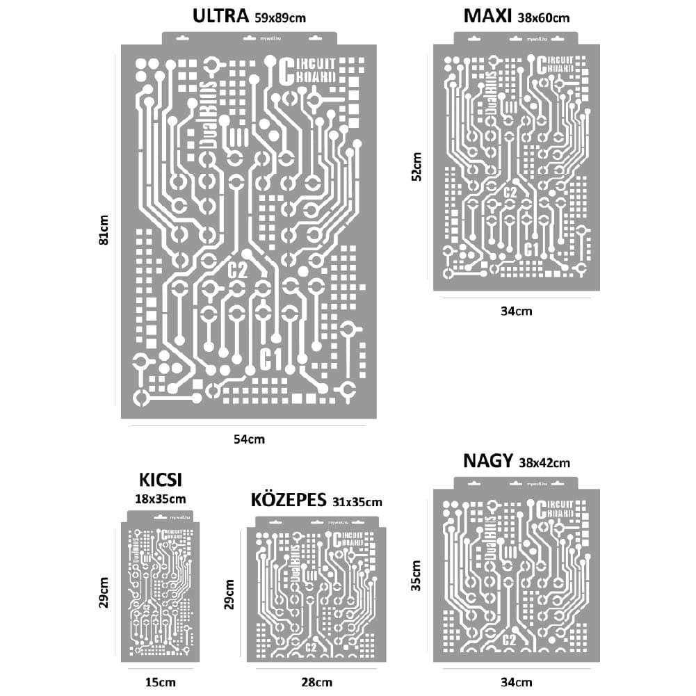 A MyWall Áramkör 01 stencilcsalád a digitális világ letisztult, mérnöki esztétikáját hozza el az otthonod falára. Szögletes, éles vonalvezetésével olyan, mintha egy mikrochip belső világába nyernél bepillantást – csak ezúttal festékkel és kreativitással.