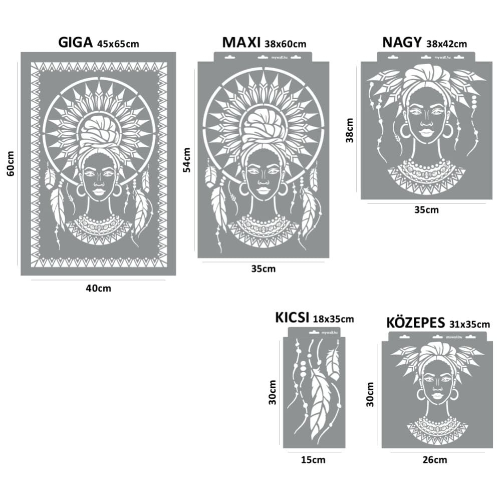 This stencil family features a beautiful design resembling the face of a Native American woman adorned with a dreamcatcher-style headdress. The stencil is highly detailed, with the intricate elements of the headdress complementing the contours of the face exceptionally well.