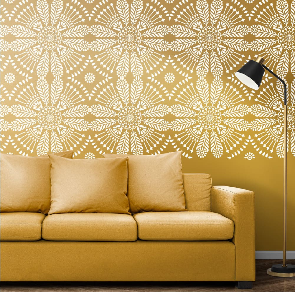The thickness of 3D stencils allow you to create a 3D, textured pattern. In this case, apply texture paste to the pattern, use a smoothing tool such as an old credit card to remove excess, and lift the stencil.