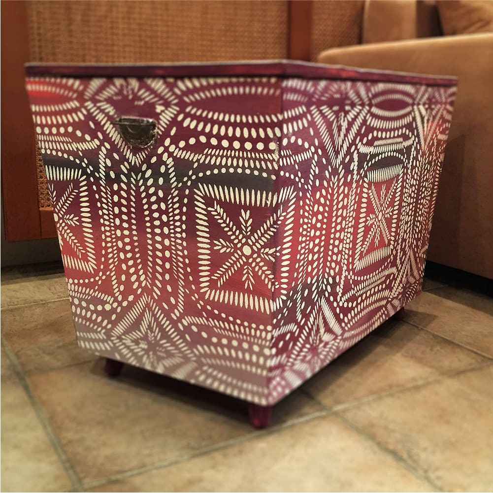 Fehér festékkel, egyenesen a fafelületre festve elefántcson berakásos mintázat hatását kelti.