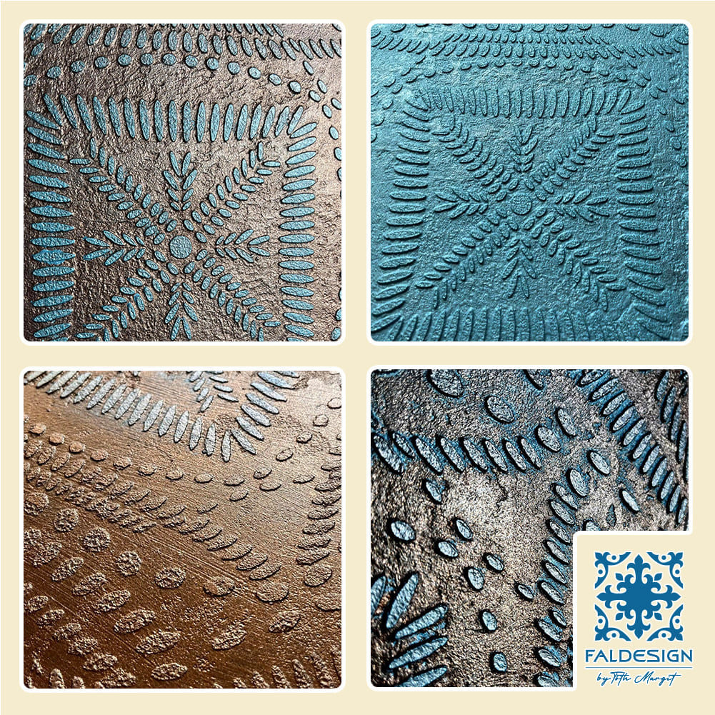 Nagyon dekoratív, nagyon különleges stencil minta. Egyedi megjelenést nyújt akár festve, de talán még szebb plasztikusan. Bútoron, falon, textilen is egyedi látvány.