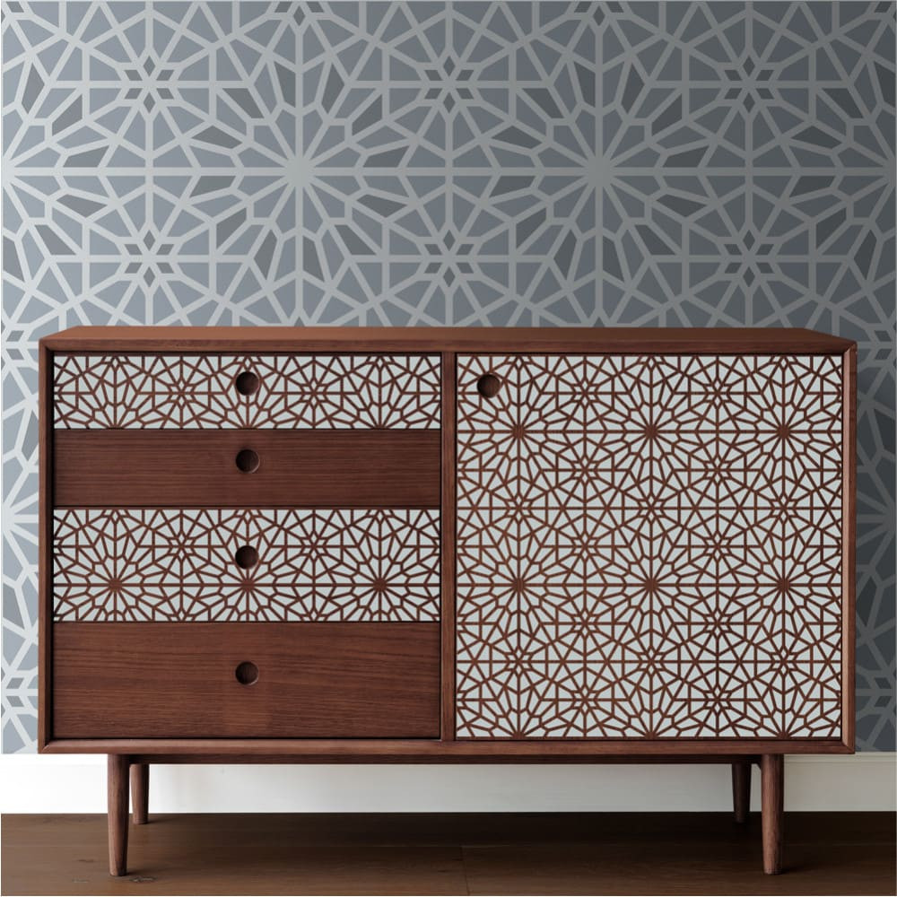Minden irányban folytatható minta. A nagy léptékű stencil falon, a kisebbek bútoron érvényesülnek.