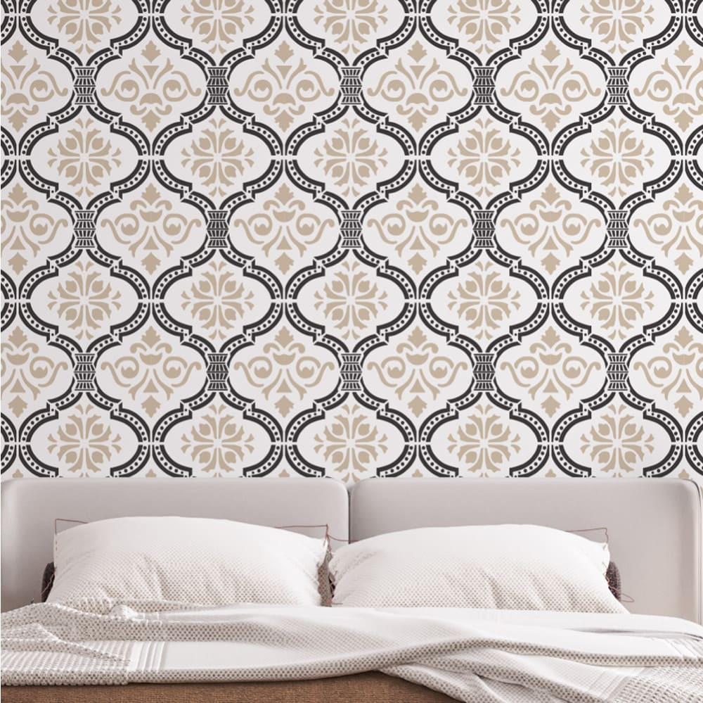 A képek között látható gyönyörű falat Farkas Hajnalka készítette, több más stencilt is felhasználva, mint pl. a Marokkó 08 és a Barokk 05.