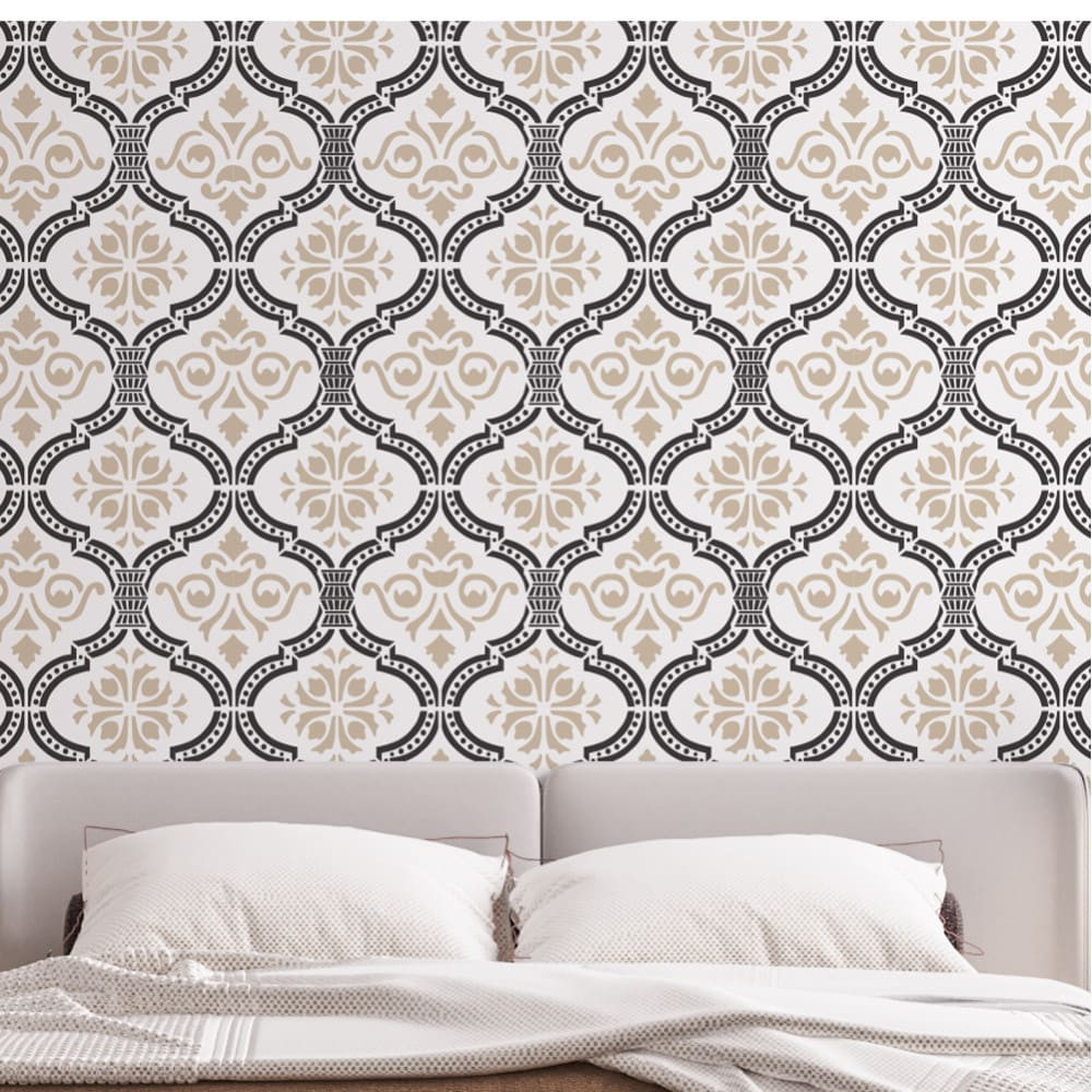 A képek között látható gyönyörű falat Farkas Hajnalka készítette, több más stencilt is felhasználva, mint pl. a Marokkó 08 és a Barokk 05.