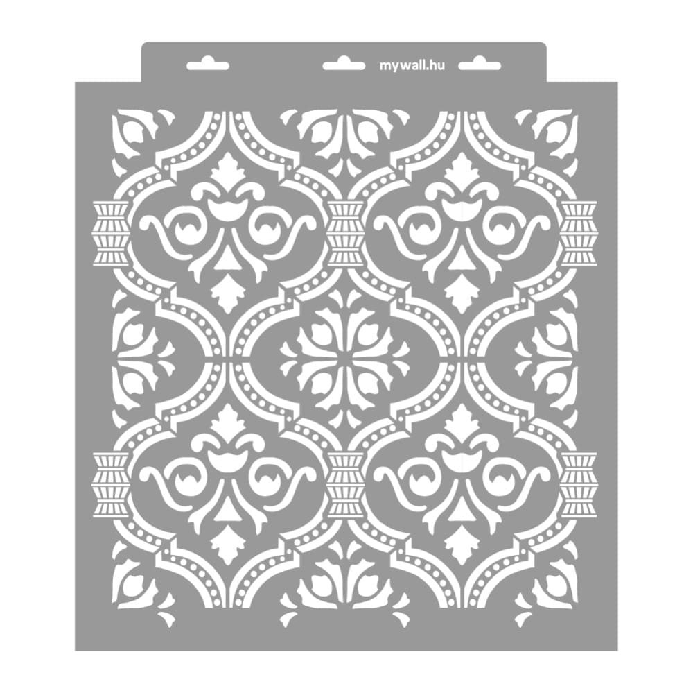 A képek között látható gyönyörű falat Farkas Hajnalka készítette, több más stencilt is felhasználva, mint pl. a Marokkó 08 és a Barokk 05.