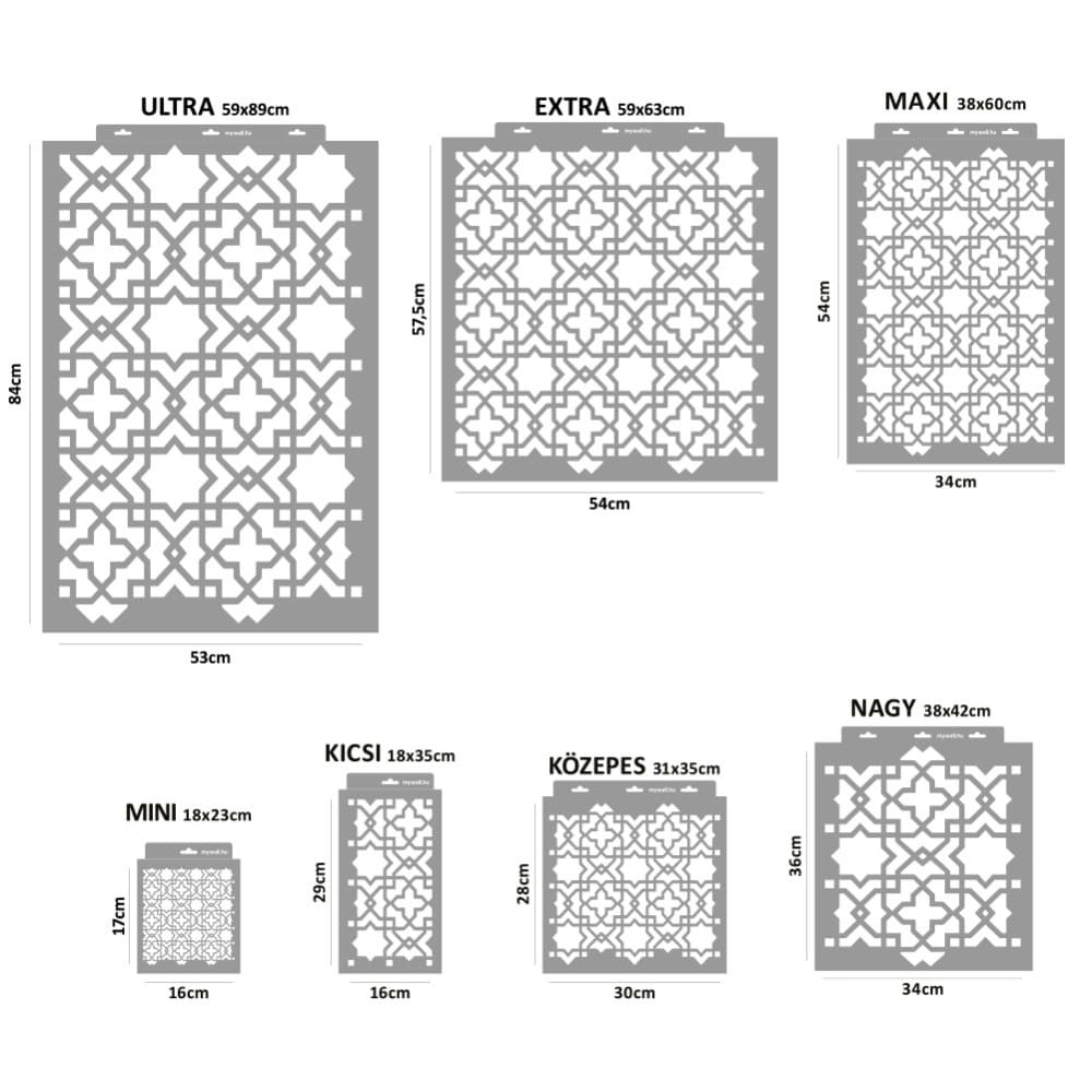 Ez a klasszikus marokkói mintájú stencil egy elegáns és stílusos eszköz, amely lehetővé teszi, hogy gyönyörű mintákat hozz létre falakon, bútorokon, textíliákon vagy bármilyen más felületen. A minta finom részletei és összetett geometriai mintái kellemes érzést adnak, és valóban egyedi megjelenést kölcsönöznek a belső térnek.
