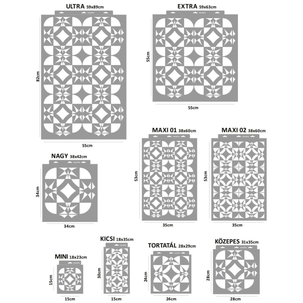 A különböző léptékű, minden irányban folytatható mozaik stencilminta lenyűgözően sokoldalú, és remekül alkalmazkodik a különböző kreatív projektekhez.