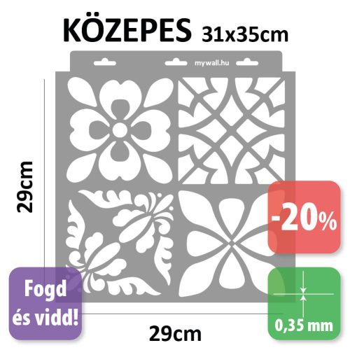 Nálunk minden stencil rendelésre készül, nem tartunk készletet. Néha azonban előfordul, hogy egy-egy darab véletlenül duplán készül el, mint például ez is. Ez a teljes értékű stencil most kedvezményesen érhető el – csak amíg ez az egy példány készleten van. Ugyanilyen mintát természetesen bármikor rendelhetsz a megszokott áron, de ez az akció kizárólag erre a darabra vonatkozik.