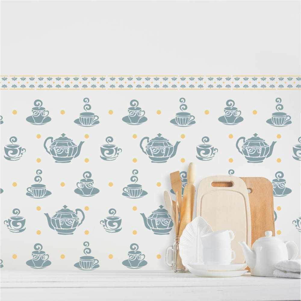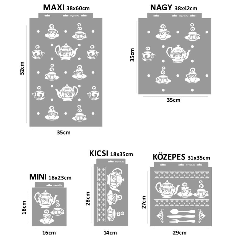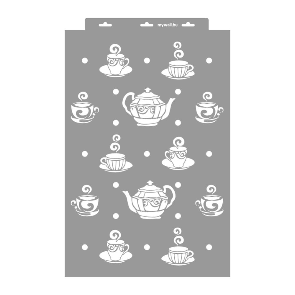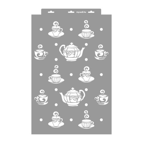 Kedves kis csészikék és teáskannák sorakoznak ezeken a stencileken. Akár teljes konyhafalon, abroszon, konyharuhán vagy kötényen használod, biztosan nagy sikere lesz.